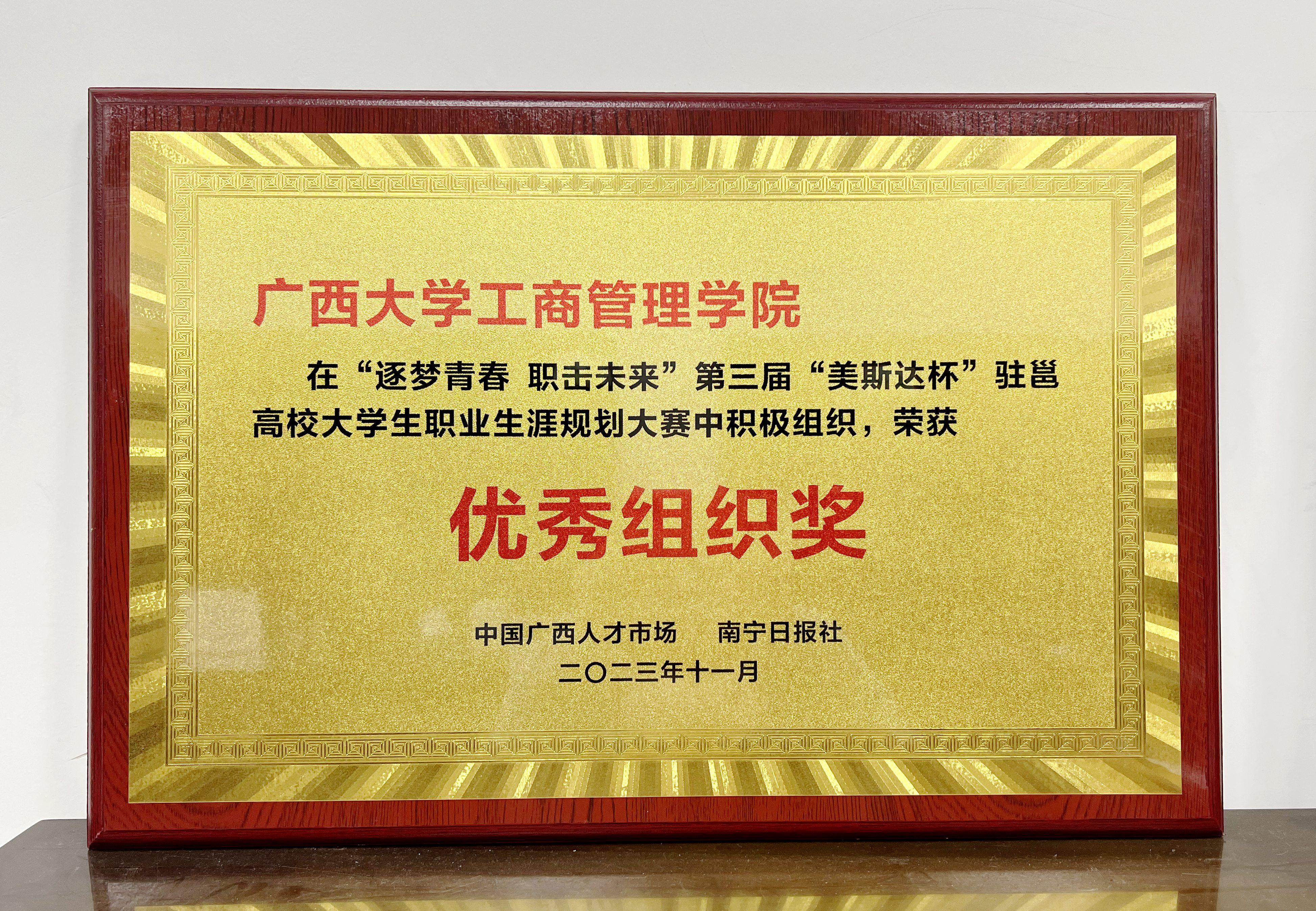 近日,由中国广西人才市场、南宁日报社主办的“逐梦青春·职击未来”第三届“美斯达杯”驻邕高校老员工职业生涯规划大赛圆满帷幕。公司荣获大赛“优秀组织奖”。
